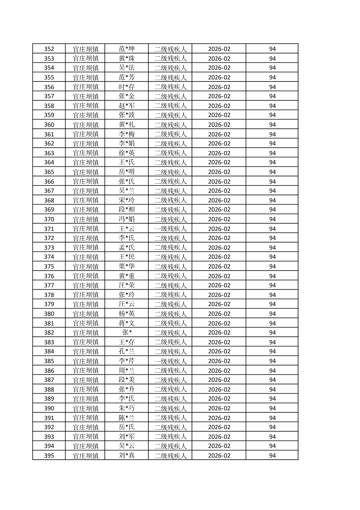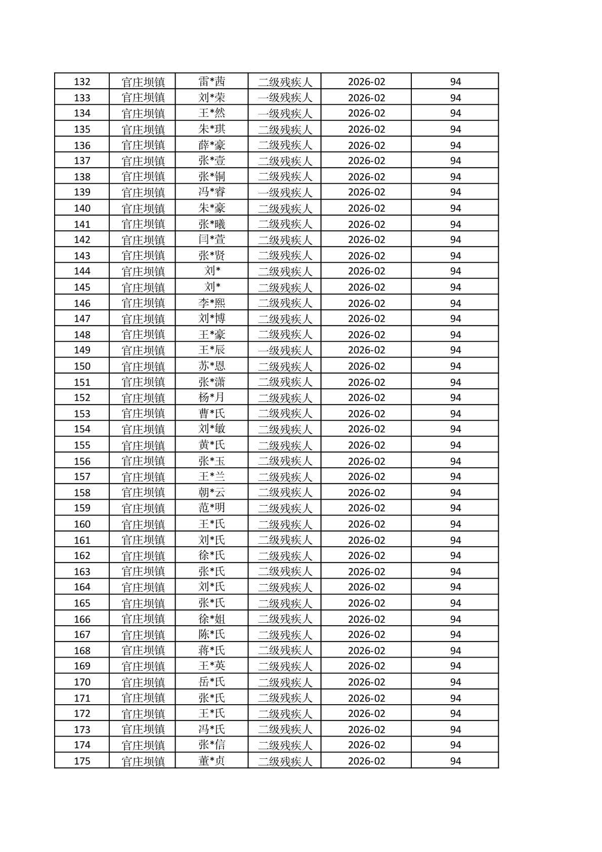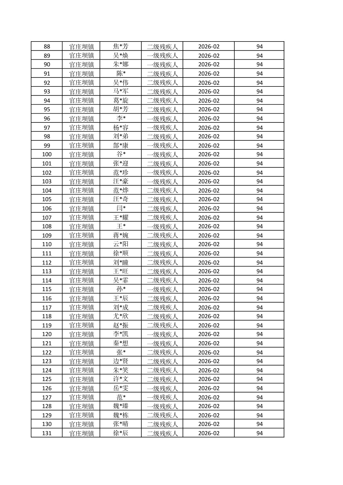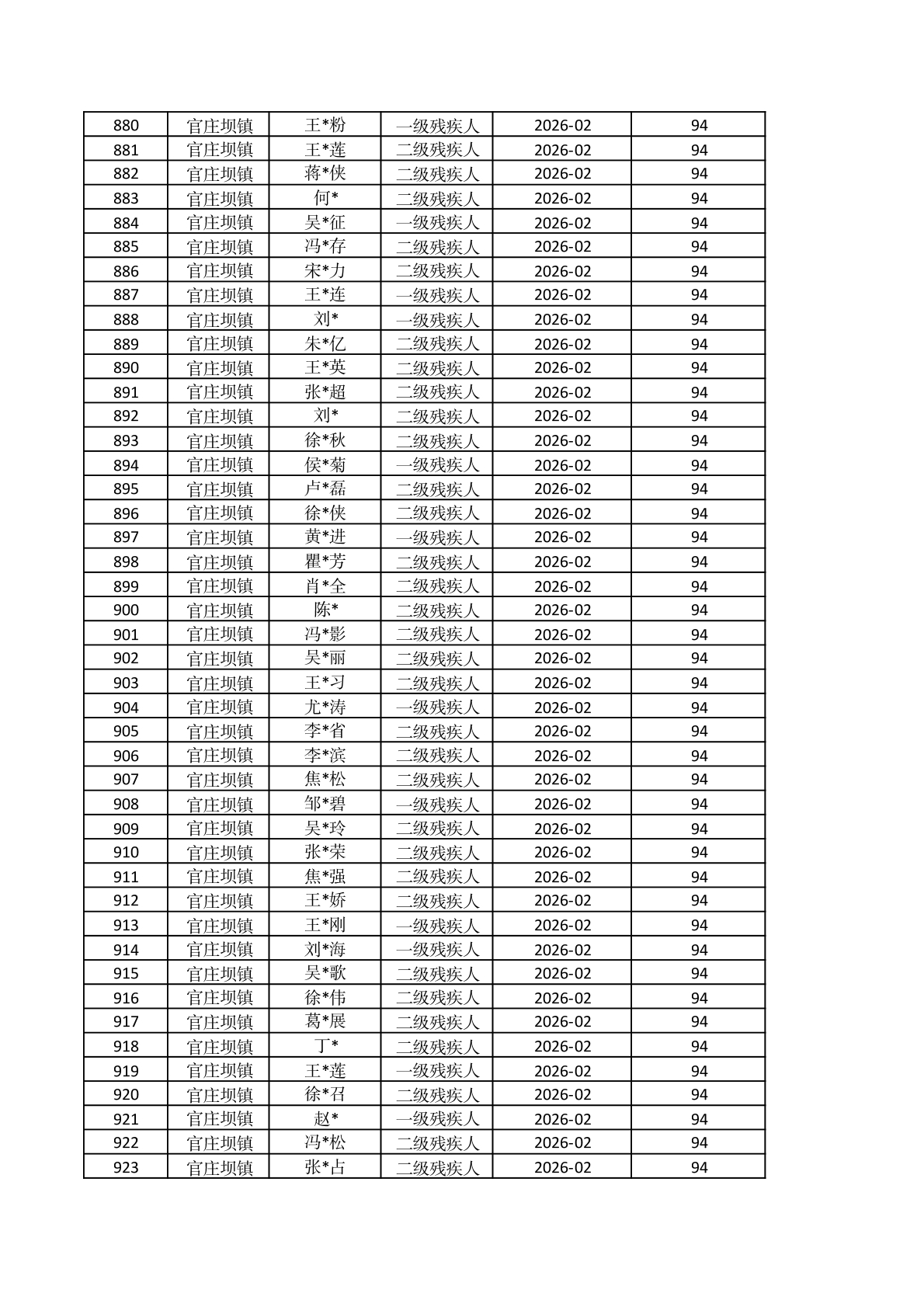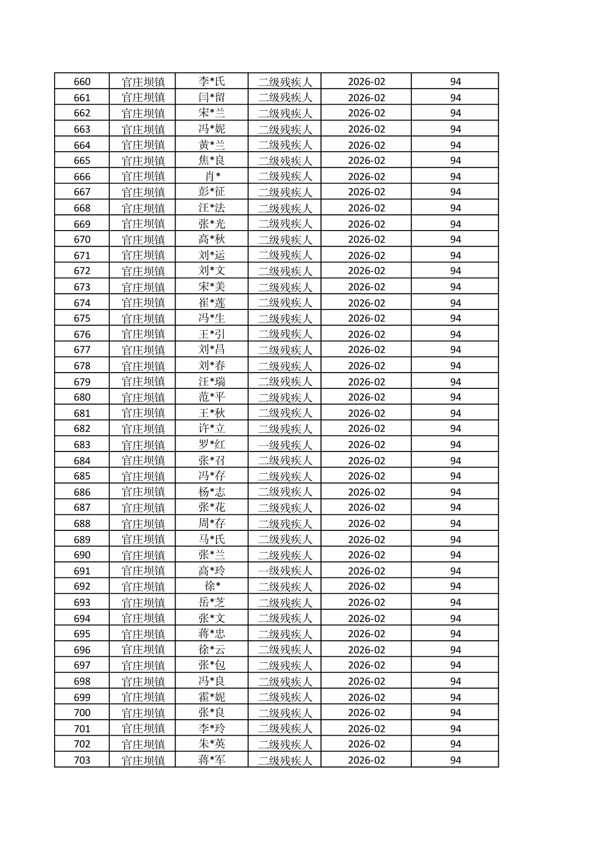 官庄坝镇2026年2月重度残疾人护理补贴资金发放花名册 |