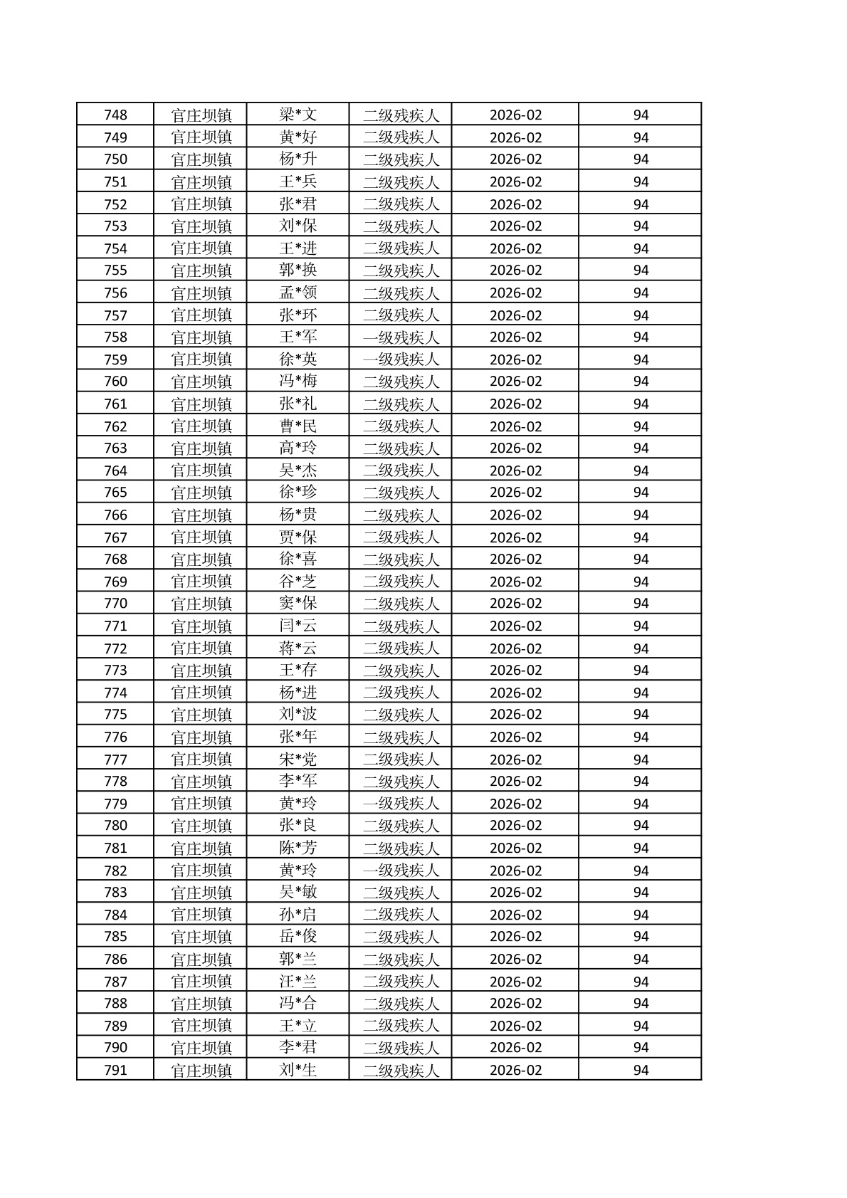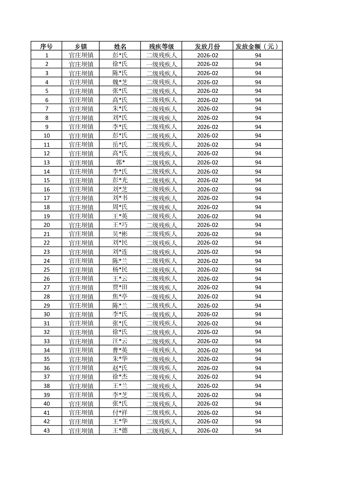 官庄坝镇2026年2月重度残疾人护理补贴资金发放花名册