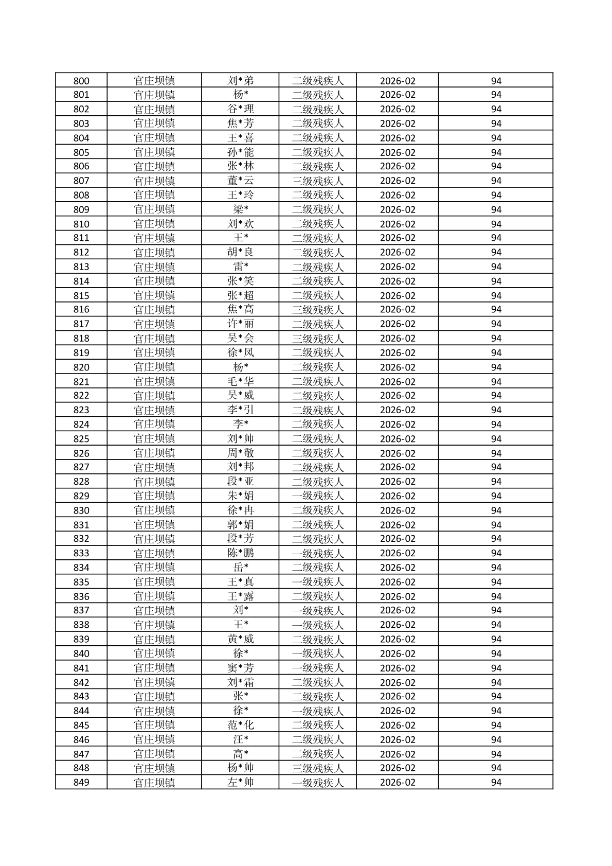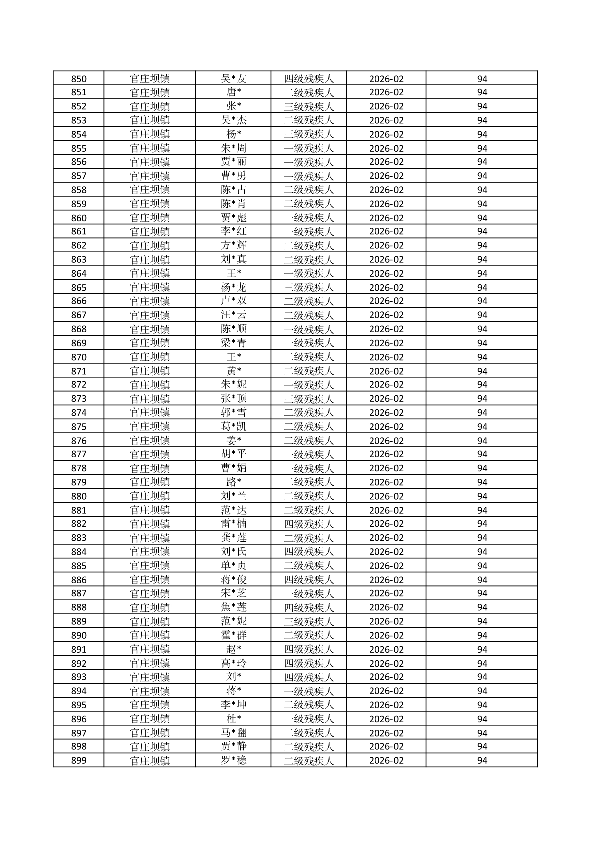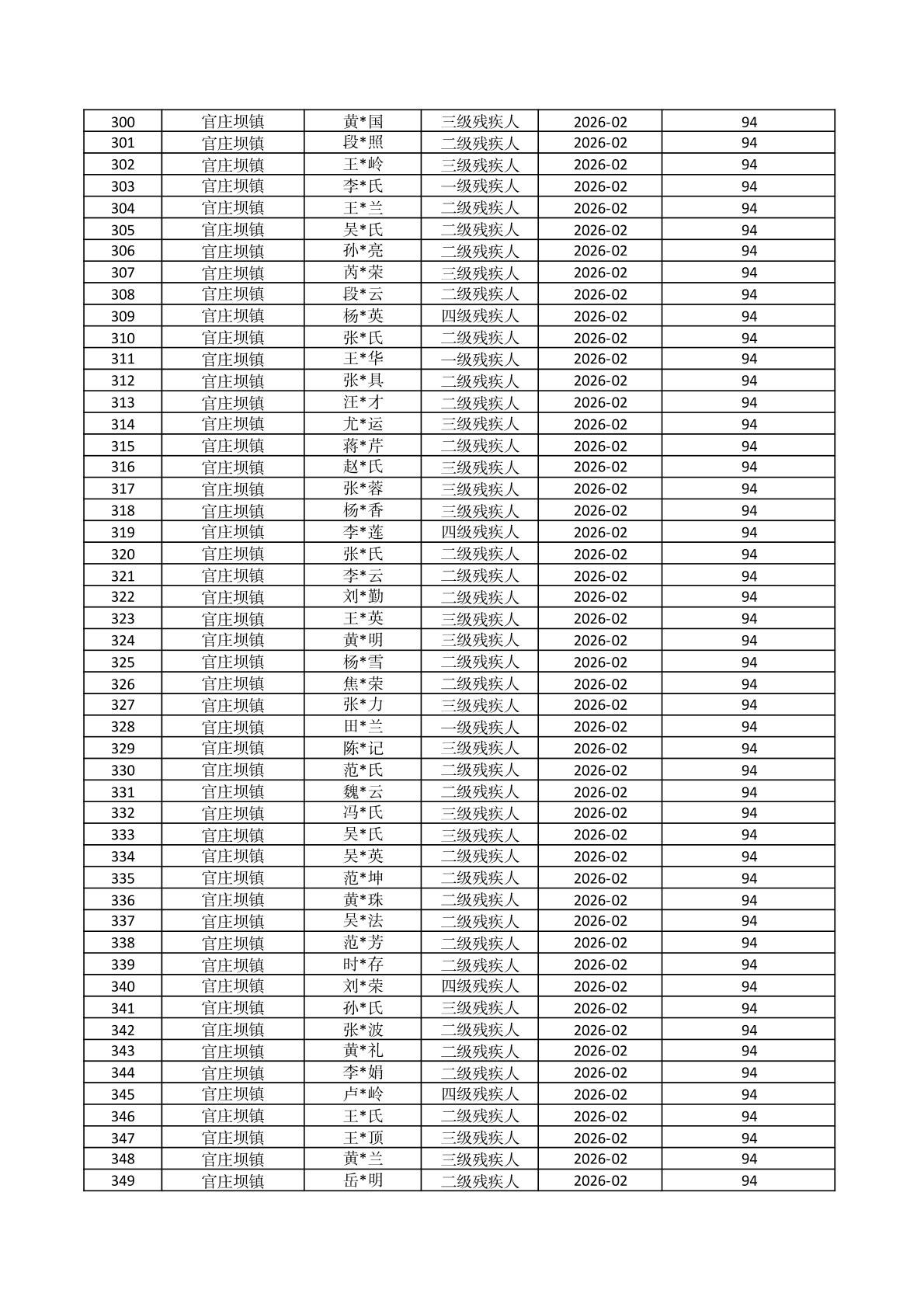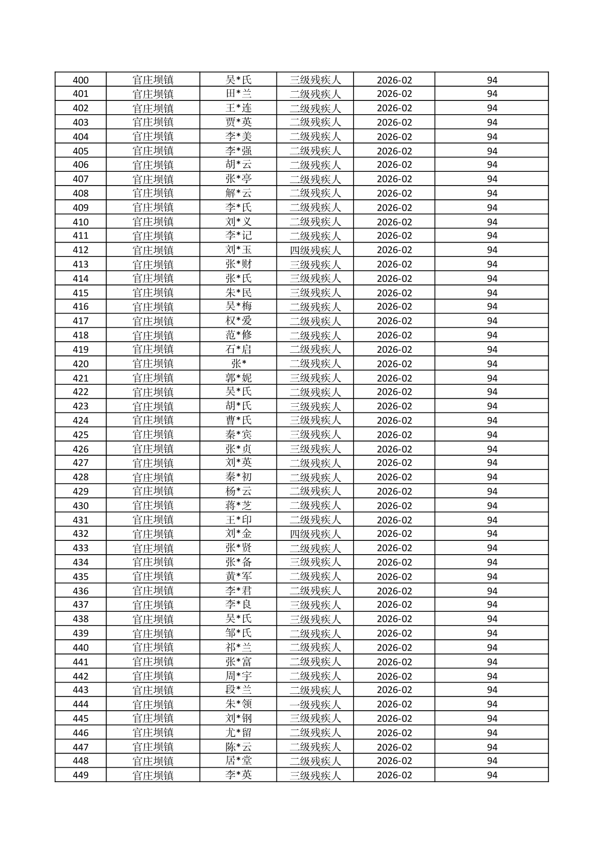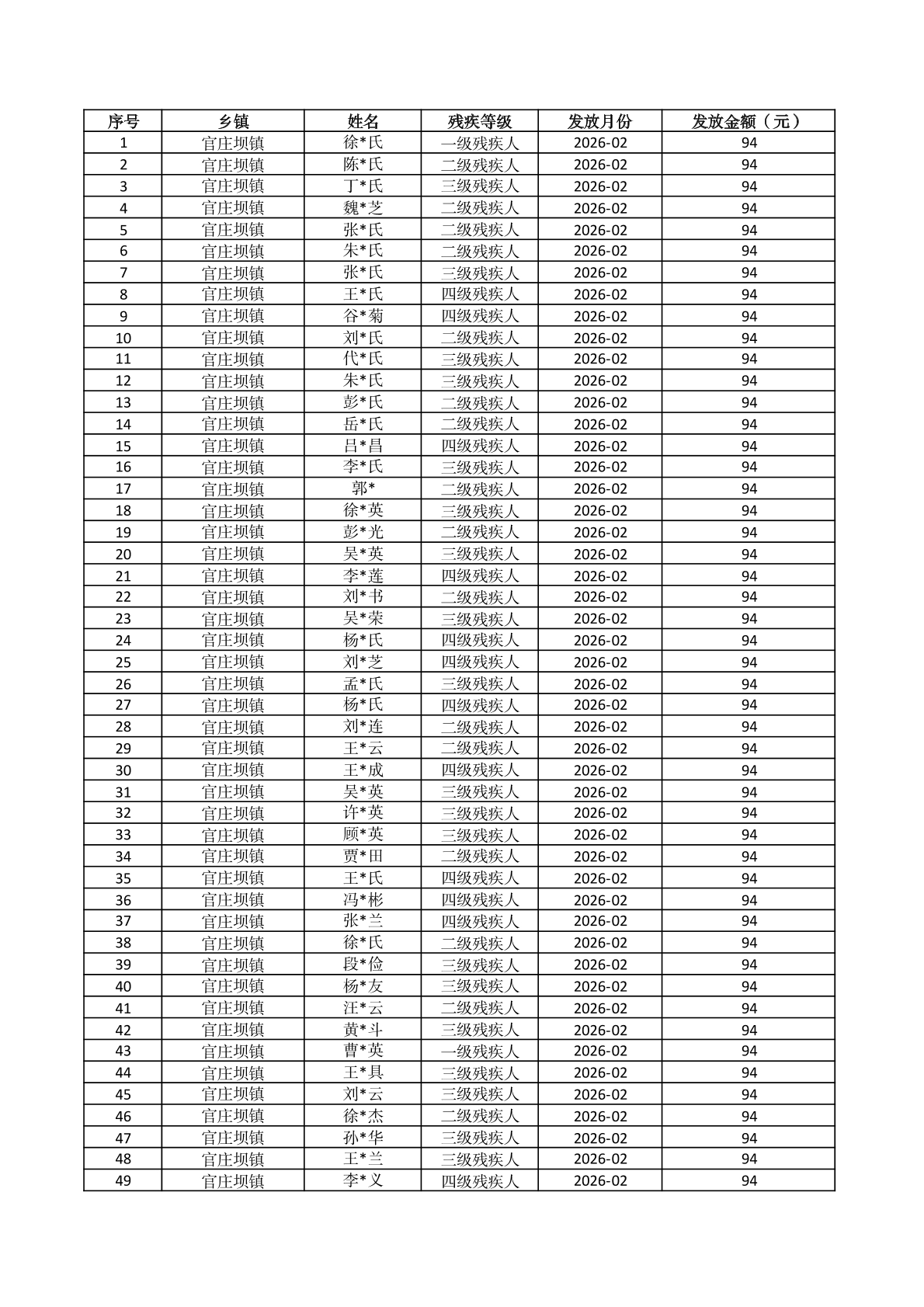 官庄坝镇2026年2月份困难残疾人生活补贴资金发放花名册 |