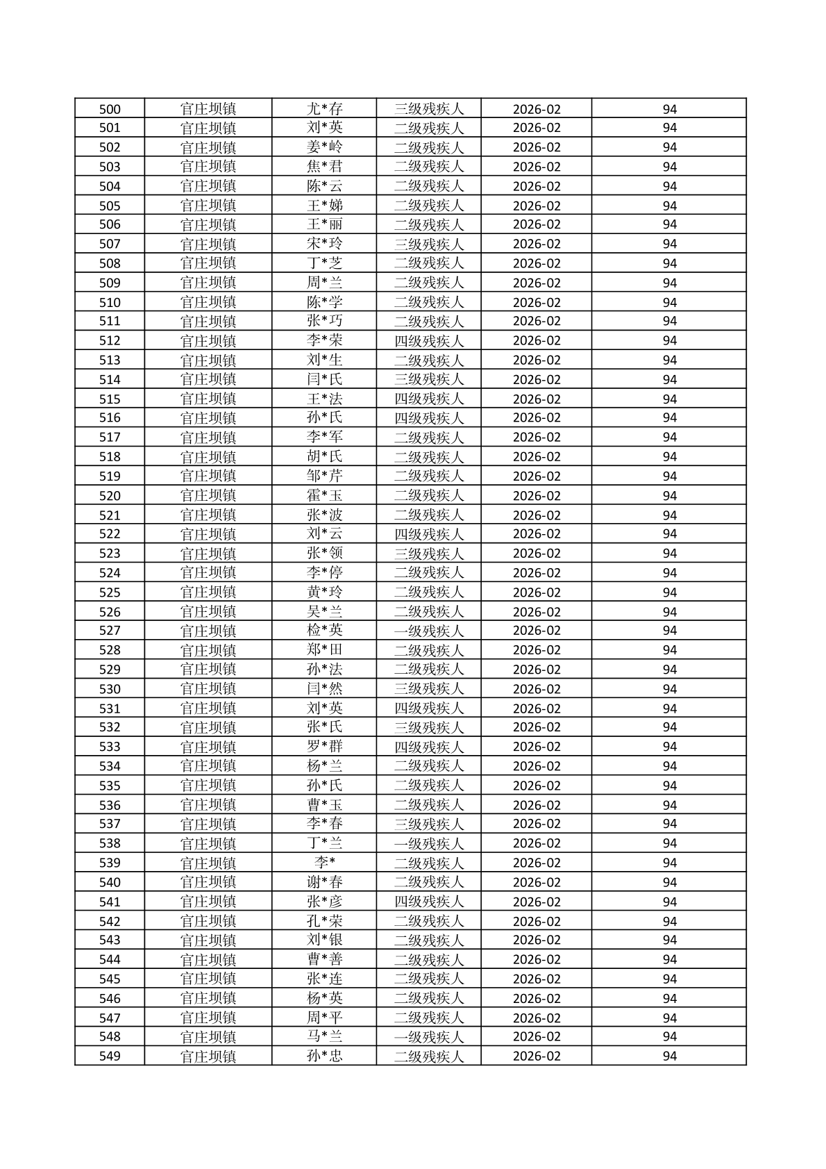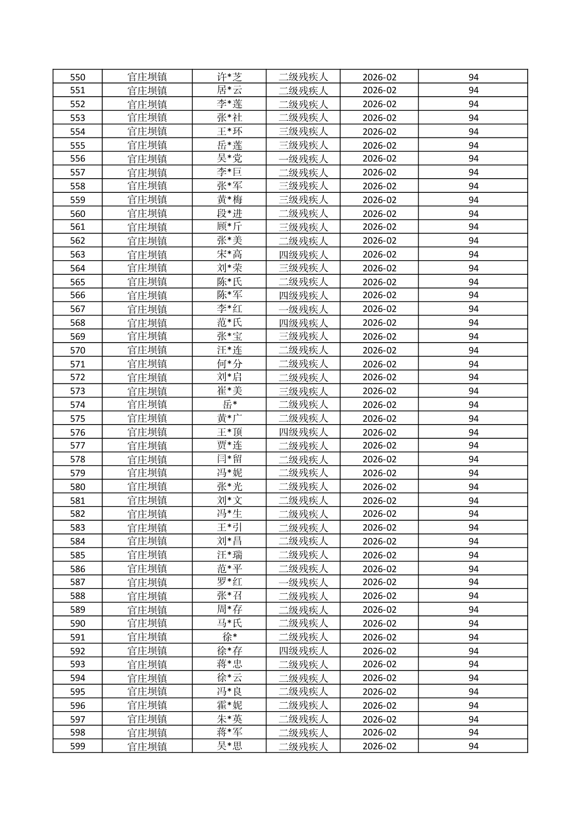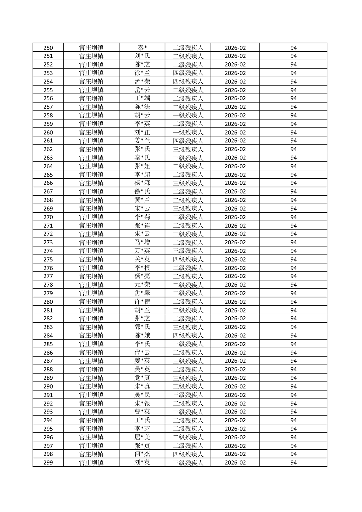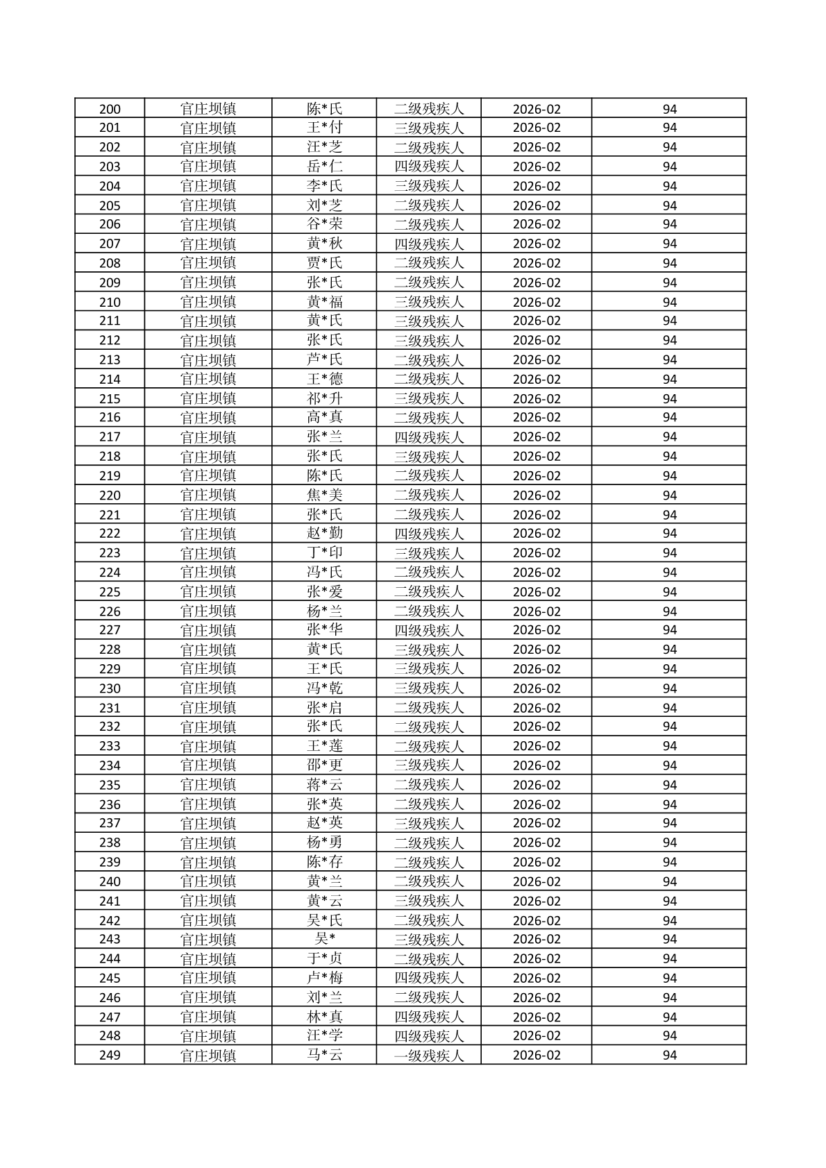 官庄坝镇2026年2月份困难残疾人生活补贴资金发放花名册 |
