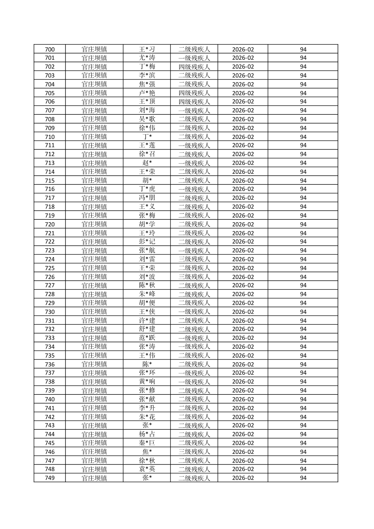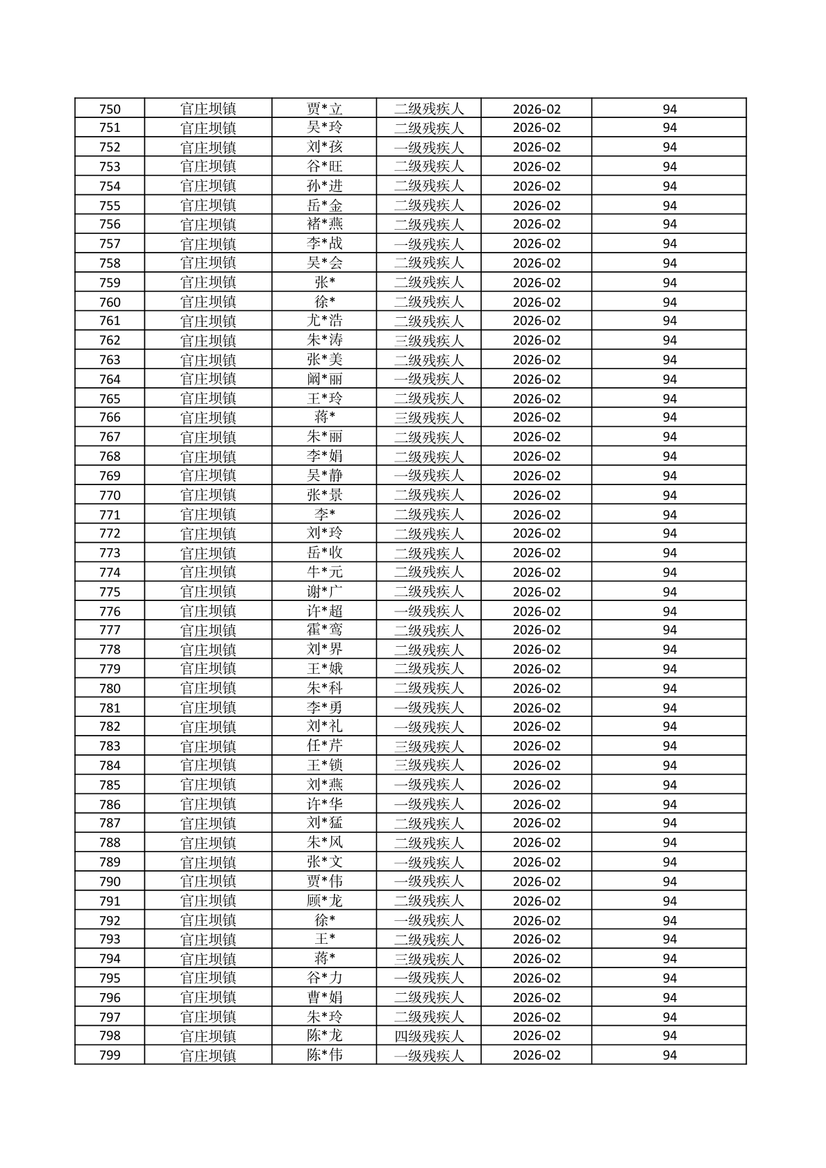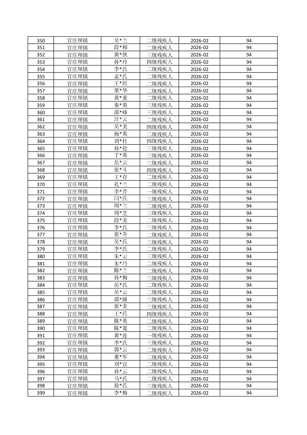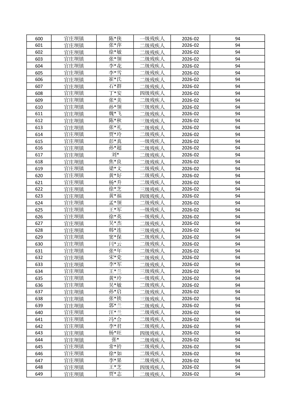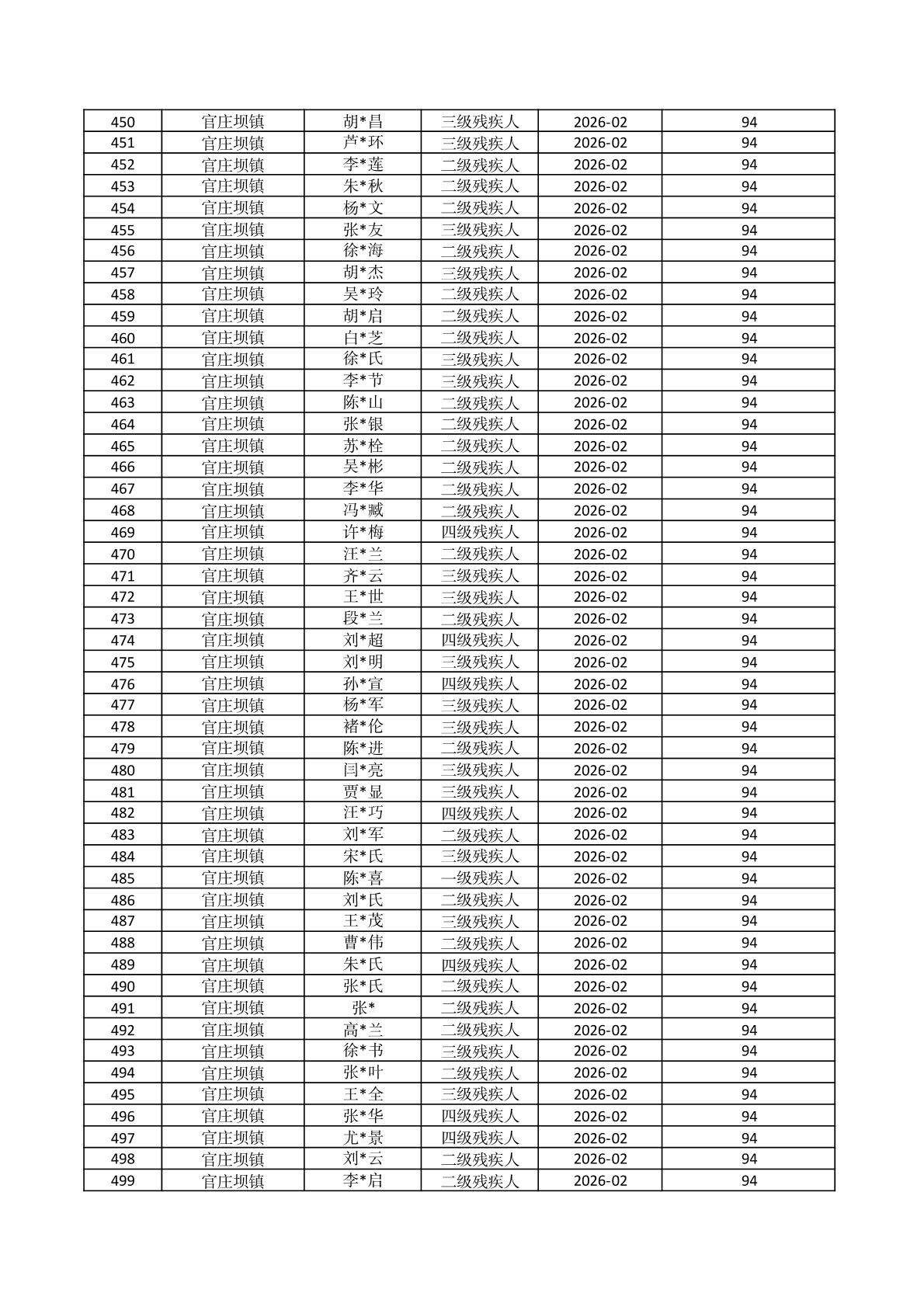 官庄坝镇2026年2月份困难残疾人生活补贴资金发放花名册 |