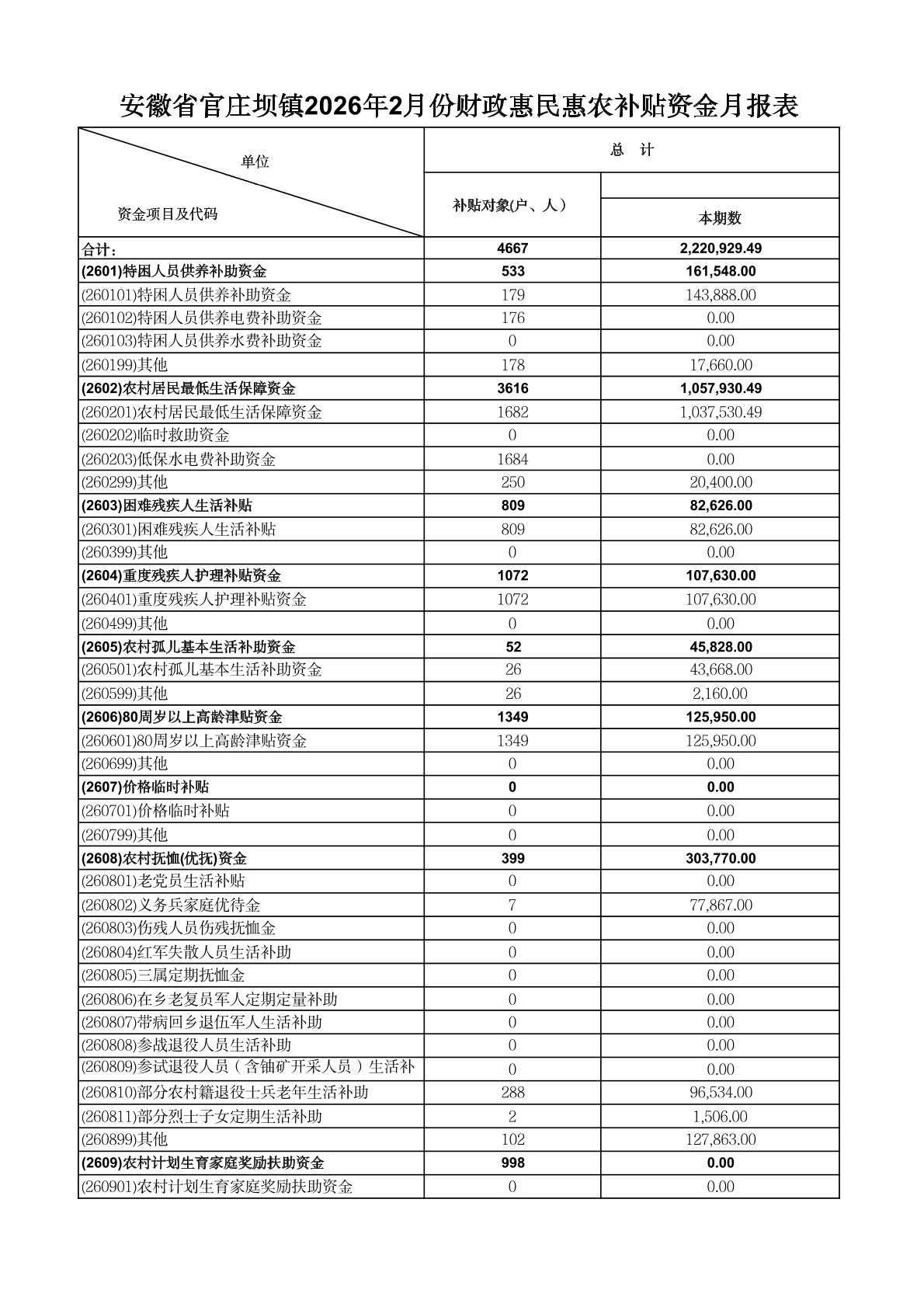 【惠民惠农资金】安徽省官庄坝镇2026年2月份财政补贴农民资金发放月报表 |