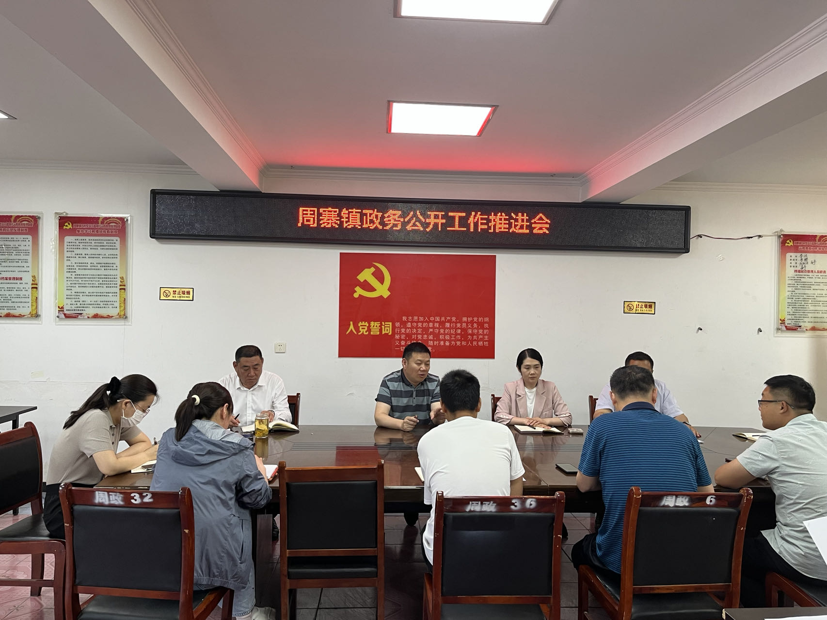 6月20日上午,在周寨镇政府财政所二楼会议室召开2023年第二季度政务公开工作推进会,镇党委书记曹金化主持会议并讲话,镇“两委”班子成员、政务公开专职工作人员以及镇直相关各站所负责人、业务人员参加会议。