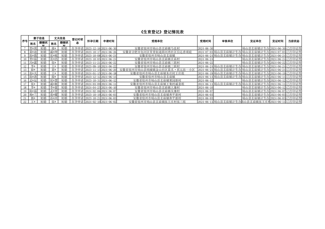 玄庙镇2024年6月《生育登记》登记情况表 |