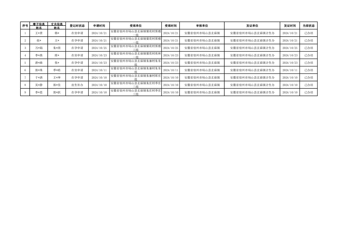 玄庙镇2024年10月《生育登记》登记情况表