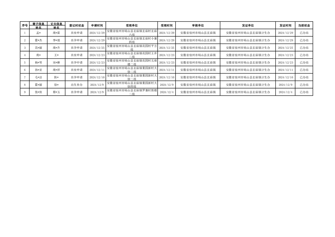 玄庙镇2024年12月《生育登记》登记情况表 |