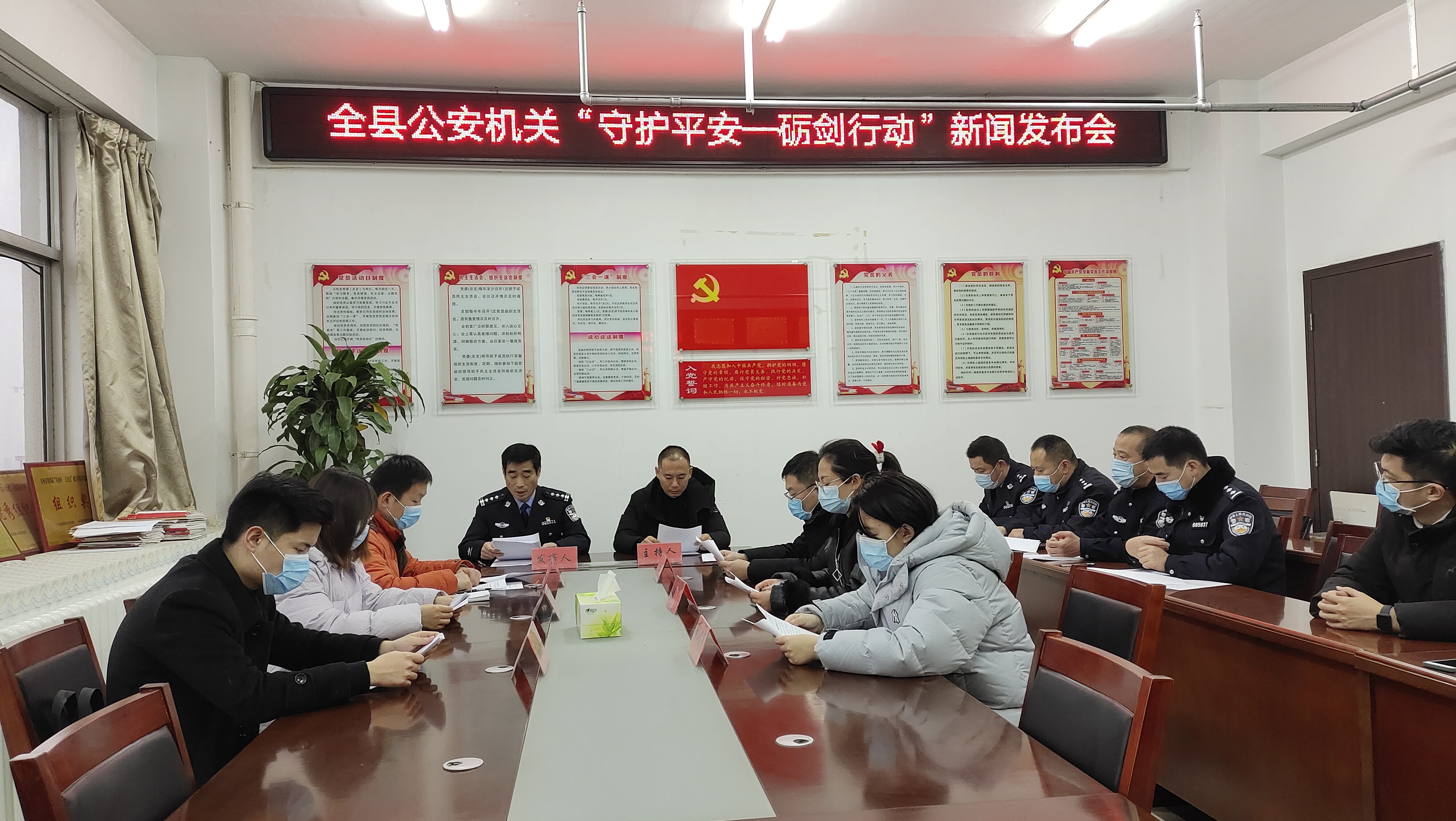 今天新闻发布会有两项议程,一县公安局党委委员、副局长卞洪涛同志发布全县公安机关“守护平安—砺剑行动”活动开展情况。二是答记者问。