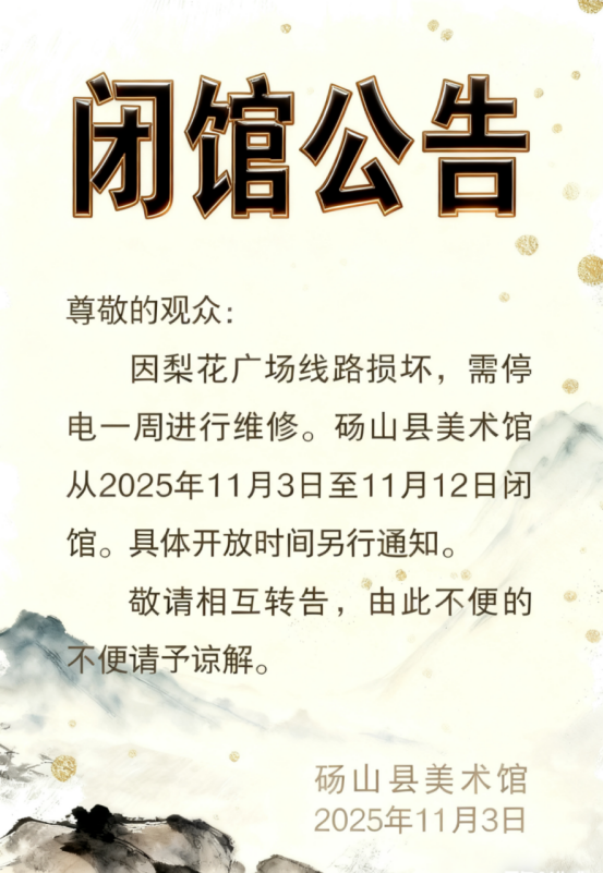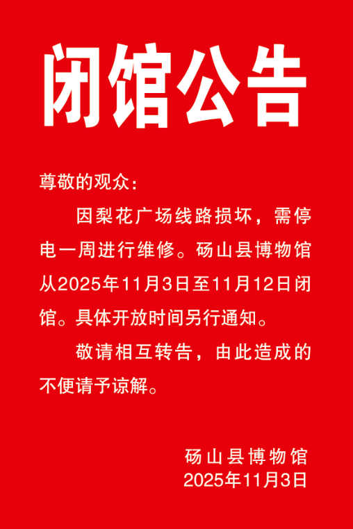 因梨花广场线路损坏,需停电一周进行维修。砀山县文化馆从2025年11月3日至11月12日闭馆,具体开放时间另行通知。