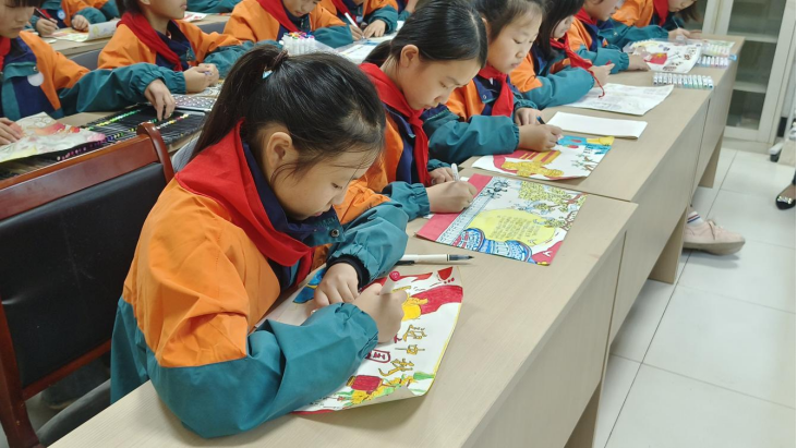 活动现场,孩子们在水彩、蜡笔、马克笔等媒介中自由创作。书法区的少年们认真书写《少年中国说》节选和“祖国万岁”等词句,笔触虽显稚嫩却饱含深情;绘画区的作品色彩纷呈,既有描绘家乡丰收景象的《周寨秋景图》,也有表现传统神话的《中秋月圆》图,更有《我和我的祖国》等主题创作,将五星红旗、天安门等国家符号与童真想象巧妙融合,展现出深厚的家国情怀和文化自信。