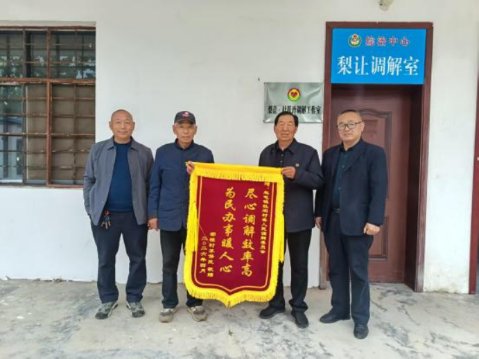 4月21日,砀山县赵屯镇杜阁村村民苏保民专程来到村“梨让调解室”,将一面印有“尽心调解效率高,为民办事暖人心”的锦旗送到调解员手中,感谢调解室高效化解了困扰已久的邻里宅基地纠纷。这面鲜红的锦旗,不仅是群众对杜阁村调解工作的认可,更是对赵屯镇“梨让调解”特色品牌治理成效的生动印证。